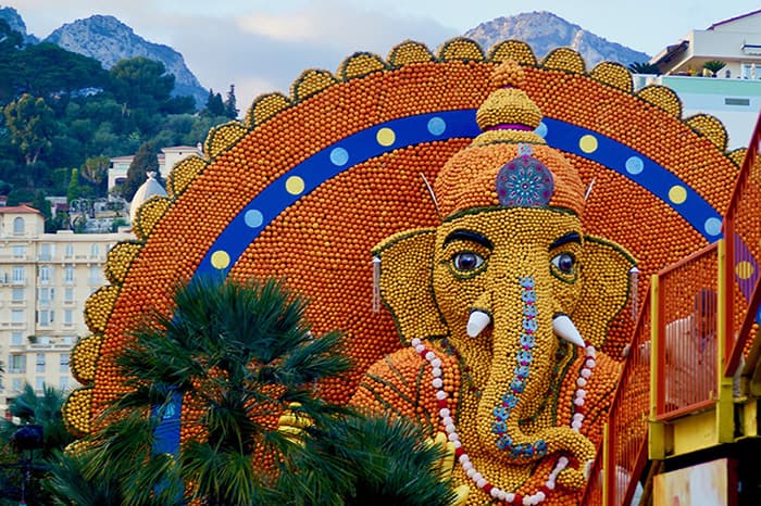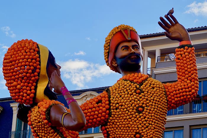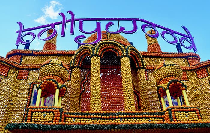 На время фестиваля вход в «Сады Биова» оформлен виде арки с воротами, сложенной из цитрусовых. На ней – надпись: «Болливуд». Внутри кружится в танце огромная пара в ярких нарядах из лимонов и апельсинов, с очень строгим выражением морд на посетителей взирают гигантские львы, высится дворец с тремя башнями, напоминающий Тадж-Махал (хоть что-то здесь по размерам меньше оригинала), присутствуют также слон и Ганеша, Будда с цветком лотоса в руке, велорикша, Кинг-Конг (а может быть это весёлый диснеевский Король Луи) и множество других персонажей, ассоциирующихся у европейцев с Индией. Все из лимонов и апельсинов.