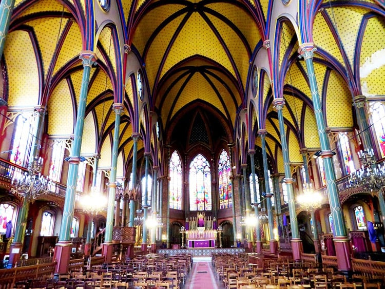 С одной стороны, это модерн – чугунные колонны и вообще металлический каркас церкви. С другой – это шикарные люстры времен Наполеона III. Кто видел люстры в апартаментах Наполеона в Лувре, тот все поймет заранее. С третьей стороны, это высоченный, парящий практически, расписанный звездами потолок, расписанные же чугунные колонны и 48 витражей тонкой работы! Ну и это не говоря уже о деревянных элементах – сын Буало был краснодеревщиком, поэтому папа решил сохранить семейный подряд и не прогадал.